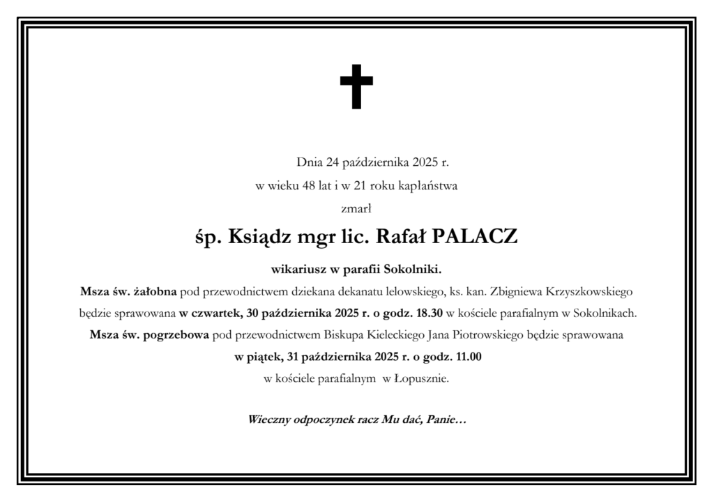 Msza św. pogrzebowa ks. Rafała Palacza odbędzie się w piątek, 31 października o godz. 11.00. Osoby potrzebujące transportu z kościoła na cmentarz będą mogły skorzystać