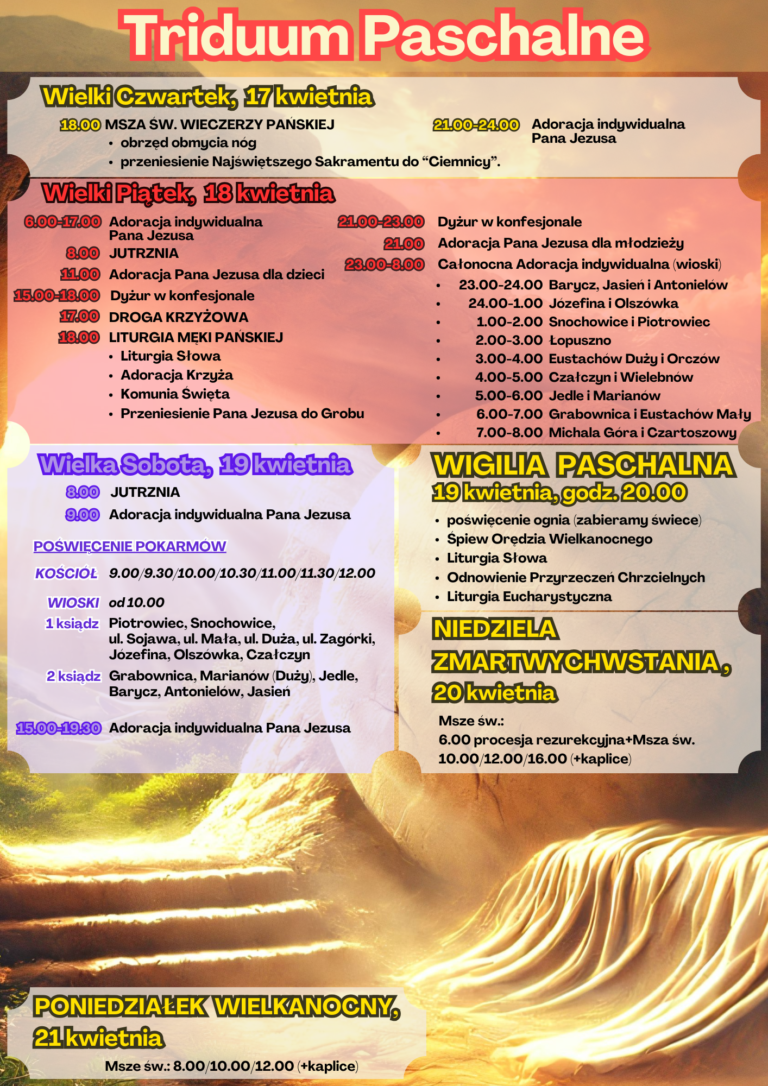 Prosimy o zapoznanie się z planem Triduum Paschalnego, szczególnie zaś z porządkiem czuwania nocnego z Wielkiego Piątku na Wielką Sobotę.
