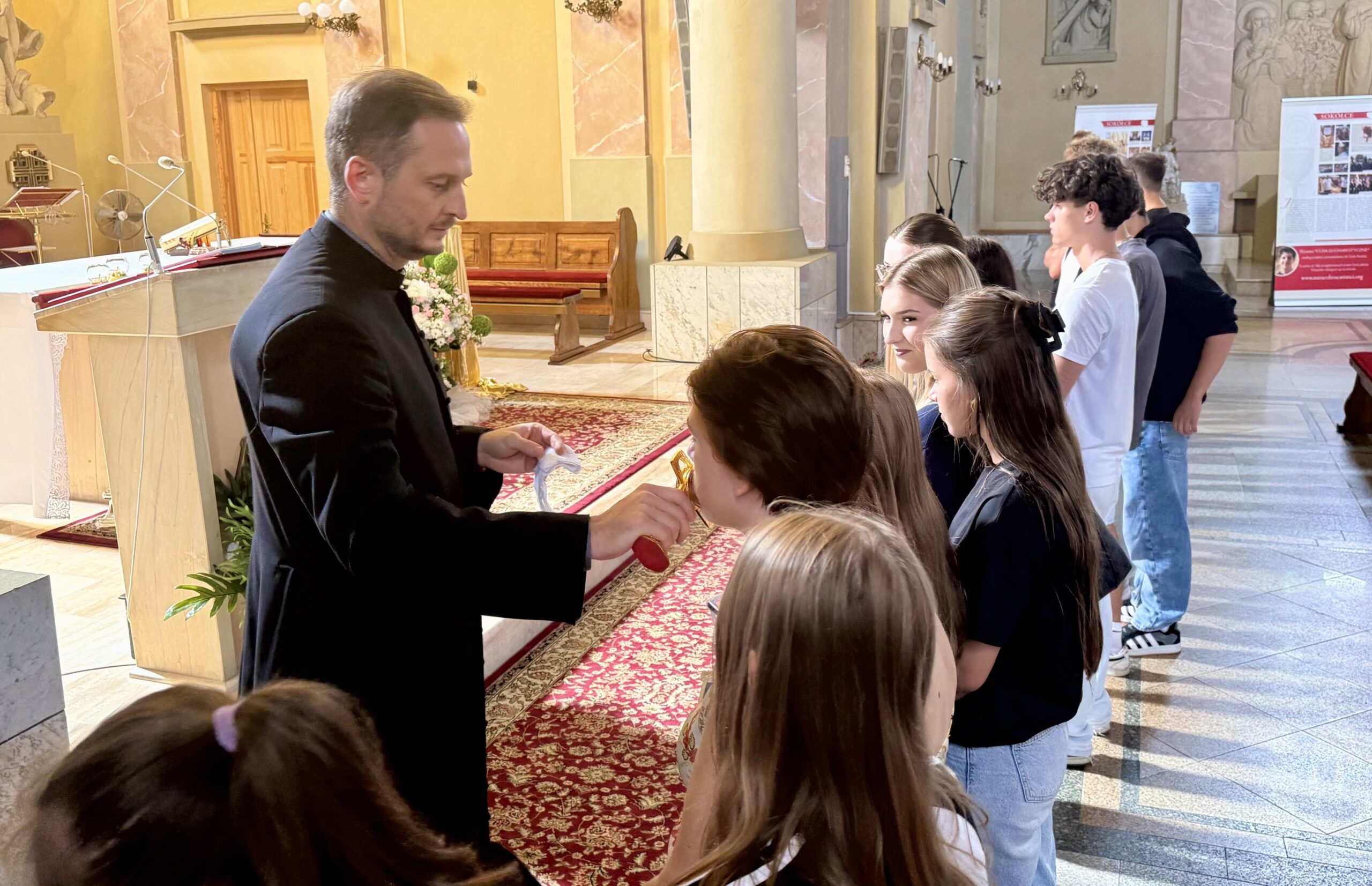 Dzieci ze Szkoły Podstawowej oraz młodzież z Powiatowego Zespołu Szkół w Łopusznie oddawały cześć relikwiom, modląc się do swojego rówieśnika.