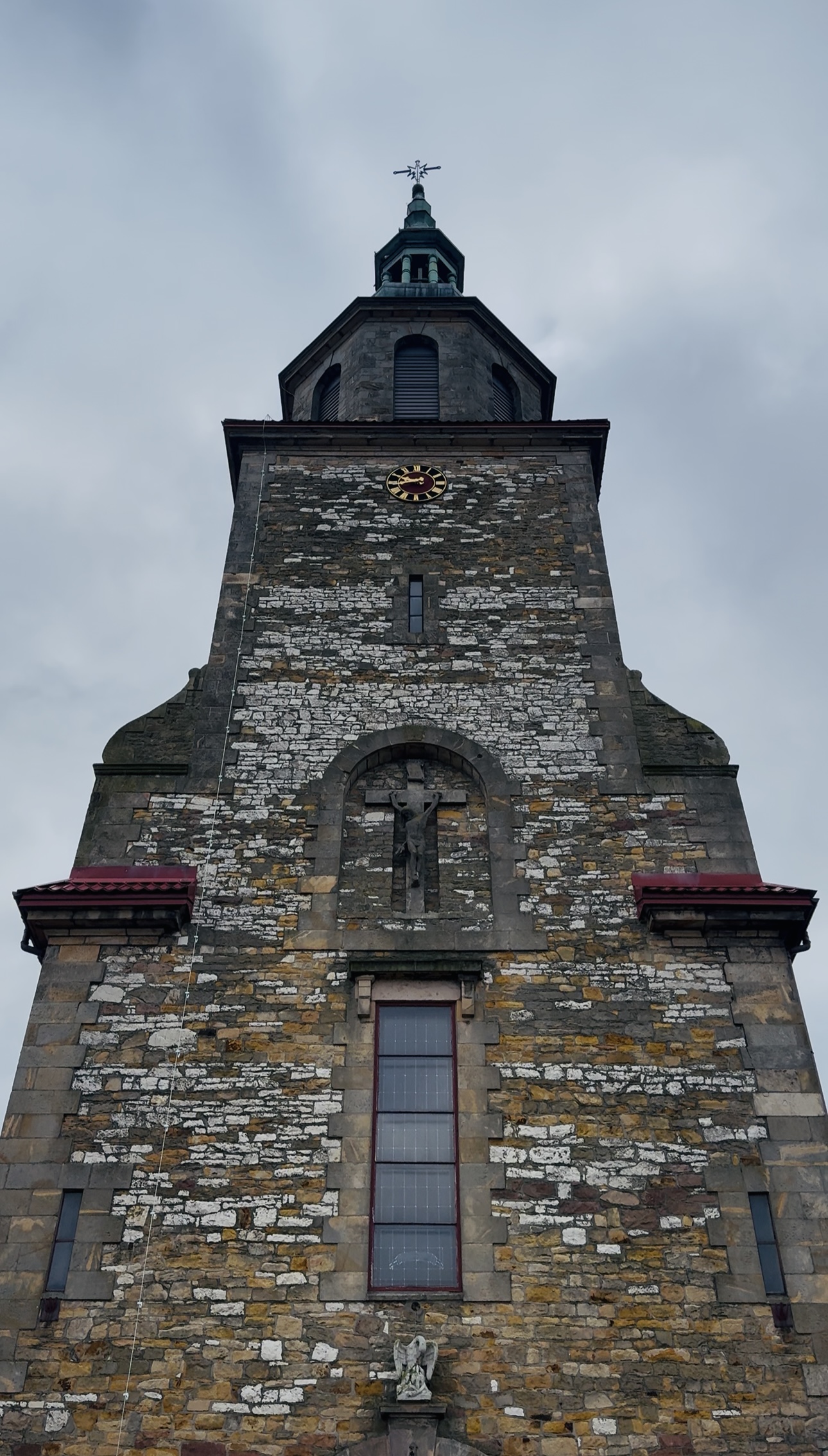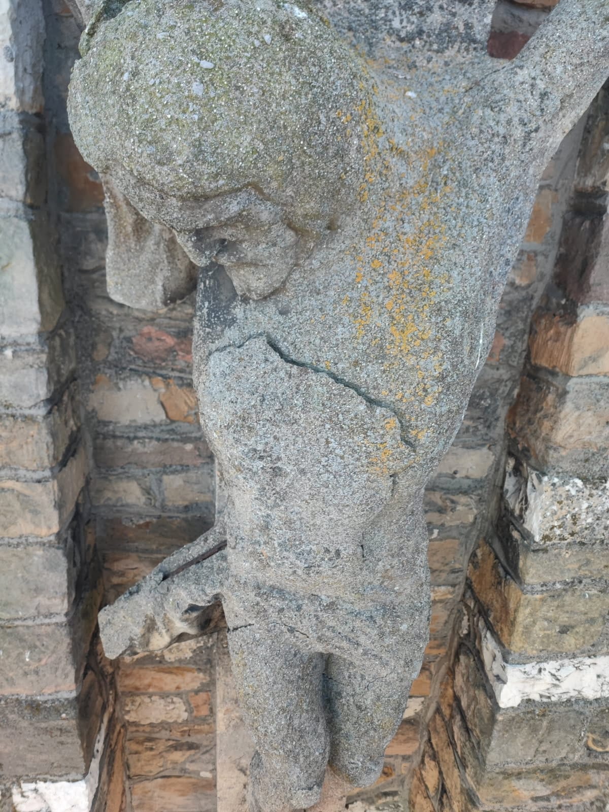 Podczas prowadzonych prac przy naszym kościele związanych z wymianą uszkodzonej instalacji odgromowej na nowoczesną, zgodną z aktualnymi normami, ujawniono uszkodzenie konstrukcji krzyża znajdującego się na frontonie świątyni. Uszkodzenie to dotyczy głównie figury Pana Jezusa, które wykazuje oznaki znacznego zniszczenia oraz korozji z powodu warunków atmosferycznych, co może stanowić zagrożenie dla bezpieczeństwa wiernych oraz przechodniów.