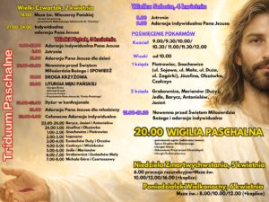 W czasie Triduum Paschalnego i Świąt Wielkanocnych w kancelarii załatwiamy tylko sprawy nagłe i pilne (związane z pogrzebami). Poprzedni Wpis Porządek Triduum Pachalnego